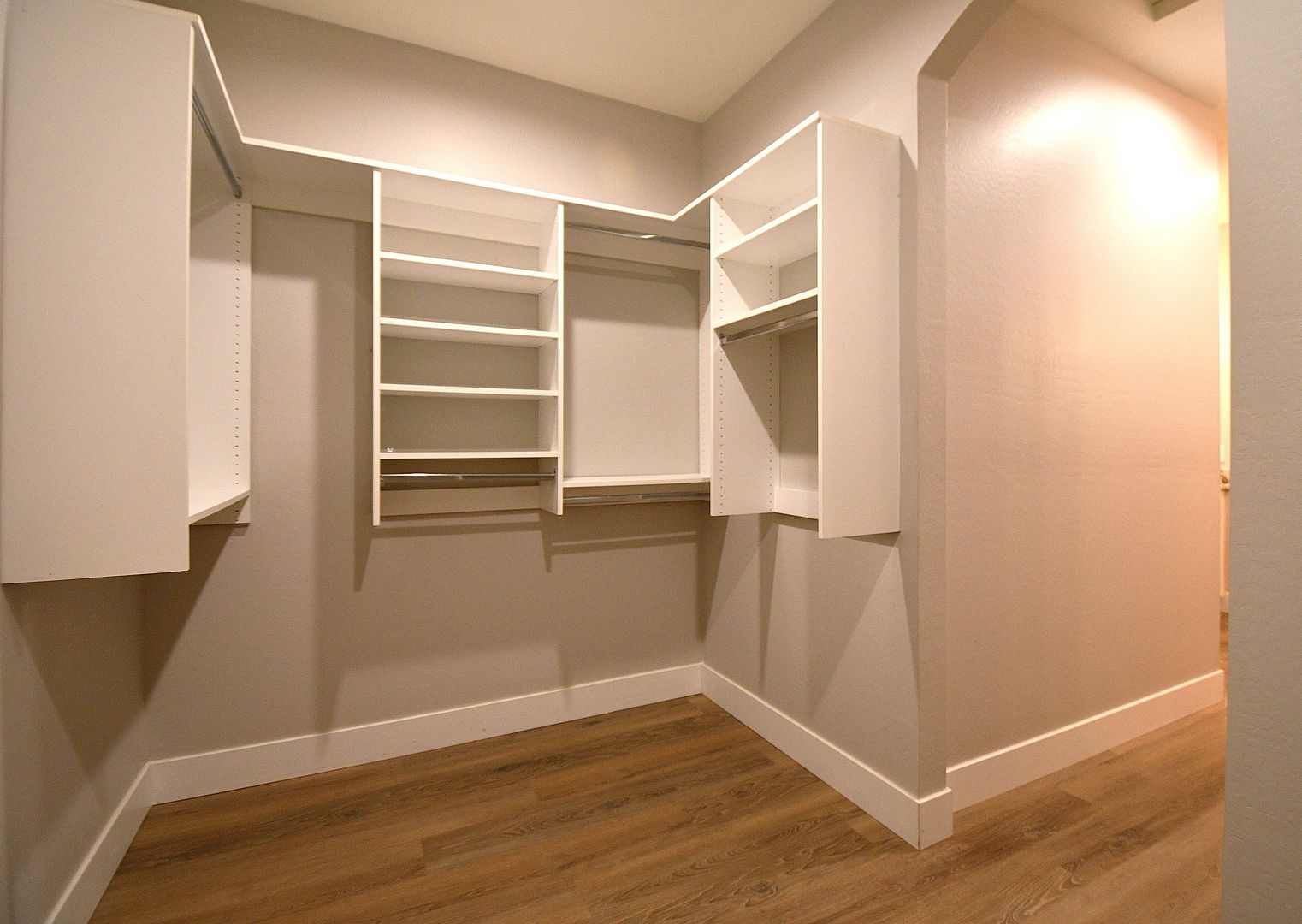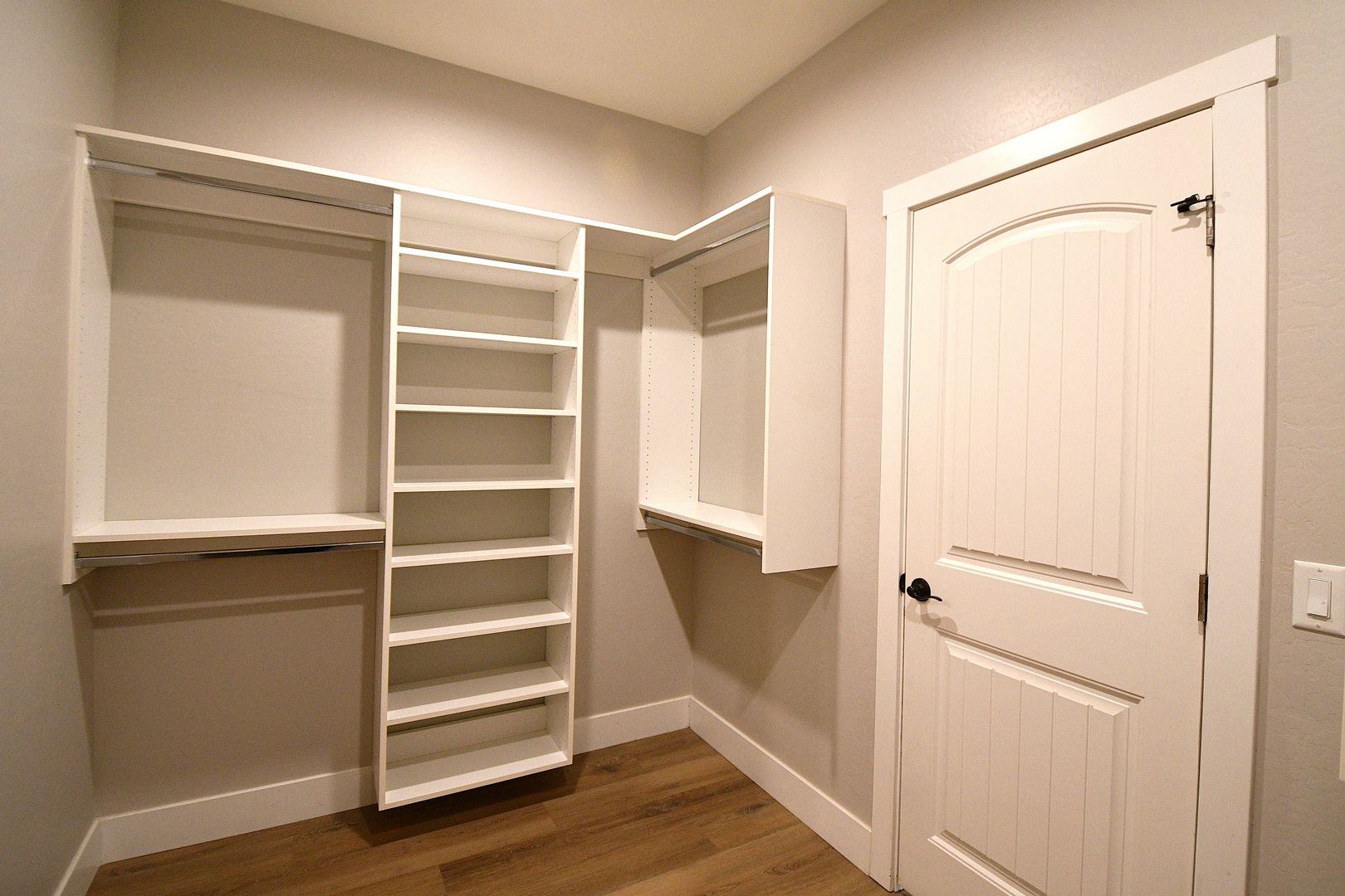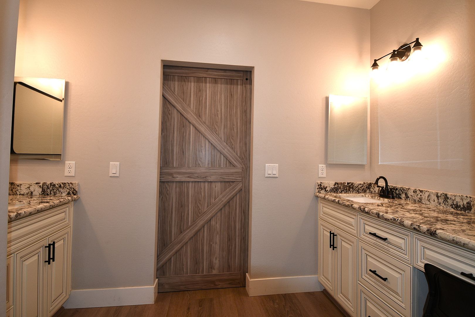 The primary bedroom offers a rustic barn door leading to a serene ensuite with an oversized walk-in shower. An expansive walk-in closet connects conveniently to the upgraded laundry room for added ease.