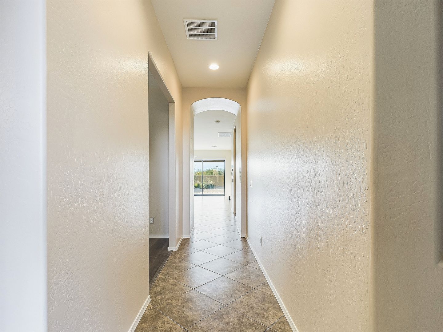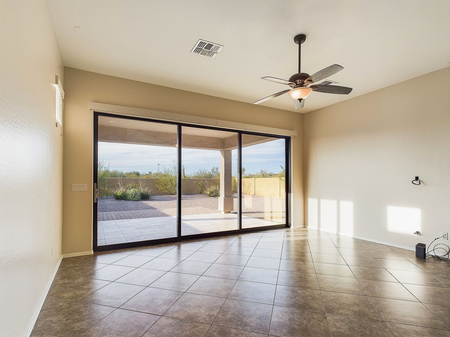 Extra-large retractable sliding glass door in the great room, featuring a remote-controlled interior sunshade for comfort and style.