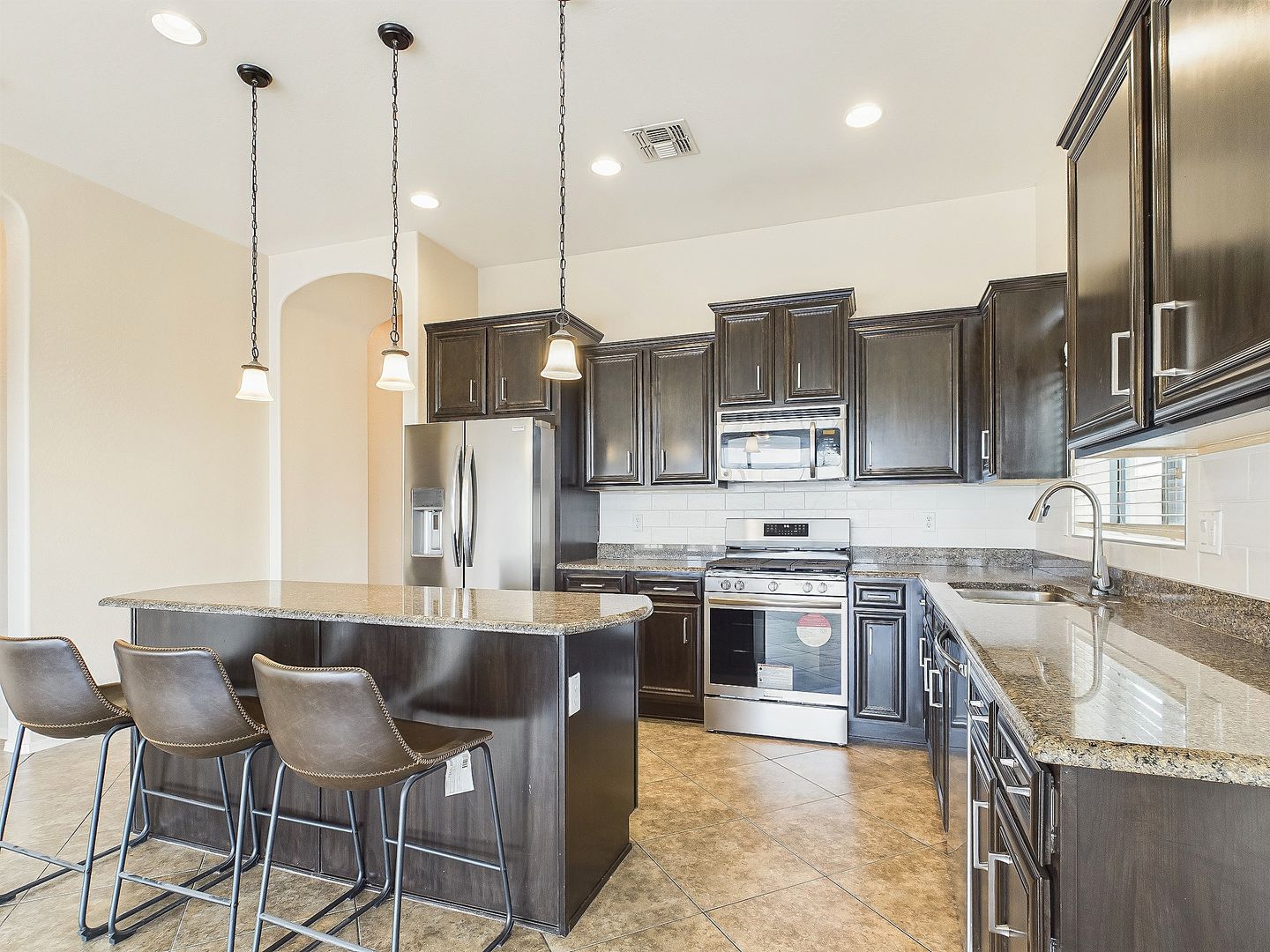 Spacious kitchen with brand-new appliances, granite countertops, a large island, and upgraded staggered dark maple cabinets.